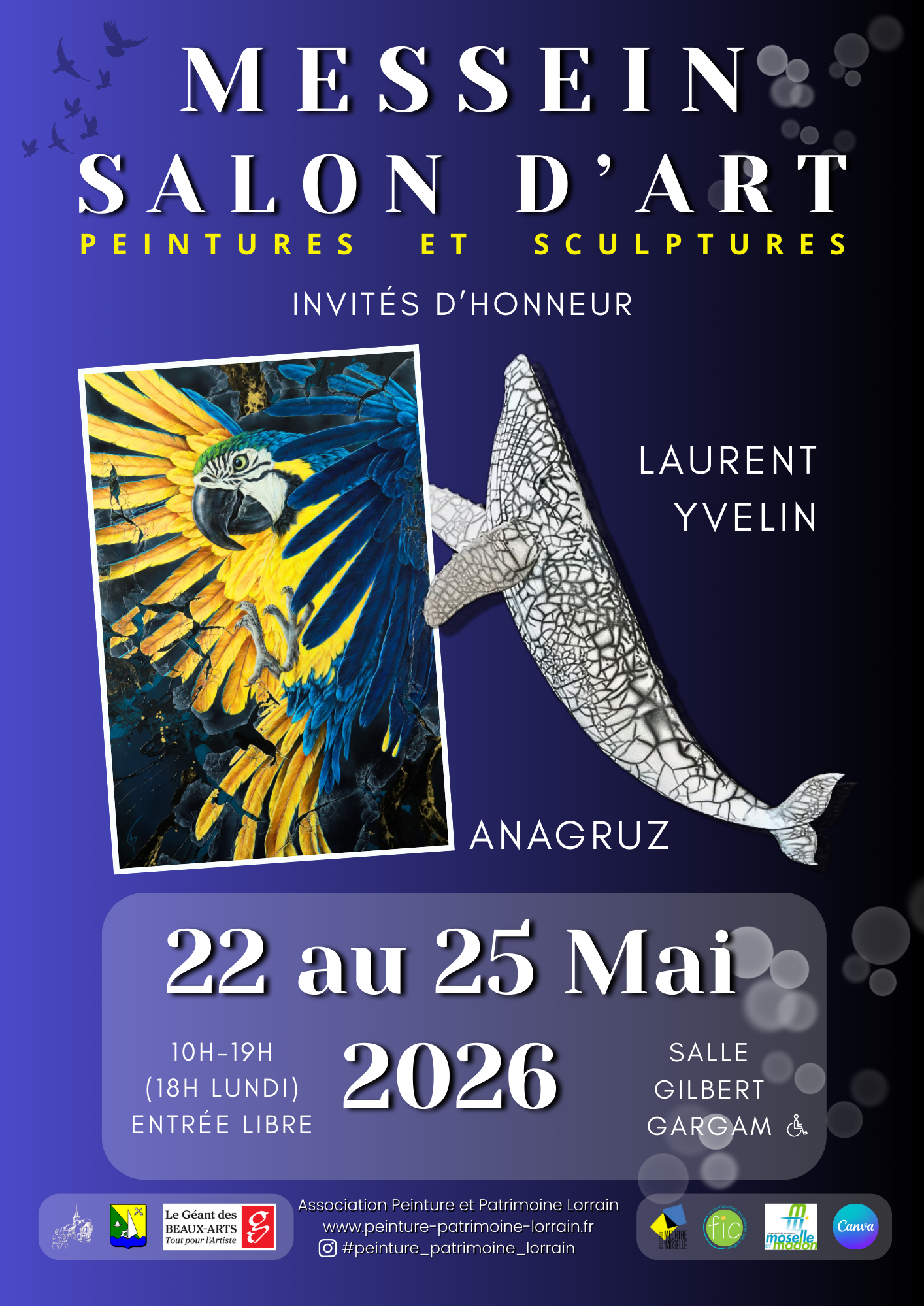 Le 33ème salon d’art de Messein ouvrira ses portes au public du vendredi 22 au lundi 25 mai de 10h à 19h, et jusqu’à 18h le lundi. Une trentaine d’artistes se partageront l’espace de la salle Gilbert Gargam. Nos 2 invités d’honneur seront Anagruz peintre animalière et Laurent Yvelin sculpteur animalier de la mer.