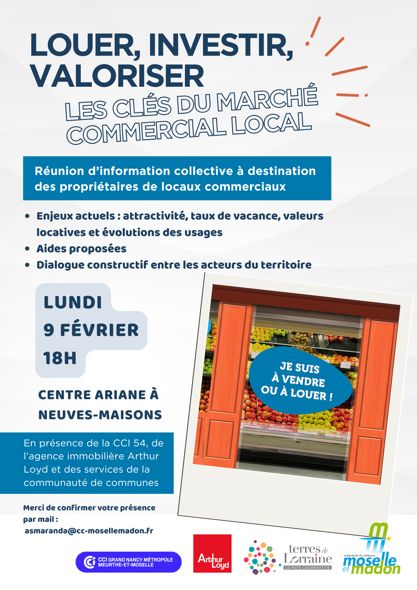 En partenariat avec la CCI (Chambre de Commerce et de l'Industrie) et la CCMM (Communauté de Communes Moselle et Madon), une réunion d'information et de sensibilisation portant sur le marché commercial local se tiendra le lundi 9 février 2026 à 18h00 au centre ariane à Neuves-Maisons.